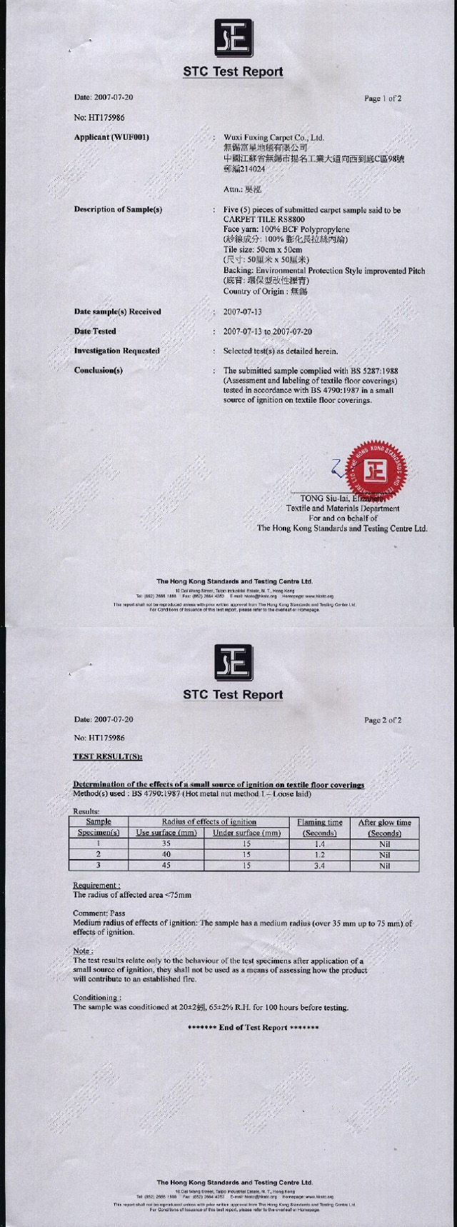 丙纶方块地毯检测报告/ 防火